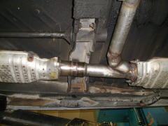 改造前の状態 新規登録時のガス検申請の際に取付けてあった触媒です。日産製の小型の触媒で管径が35φしかありません。 上で私が持っているのが今回使用する60.5φのステンレスパイプです。比較して随分太さの相違がお判りいた だける事と思います。 念の為、左右両バンクが合流する集合部を切開してみました。 写真にマウスを移動されてご覧いただけるよう に写真下部は穴が開いておらず、ここで一番排気抵抗が大きかった事が判明しました。 |