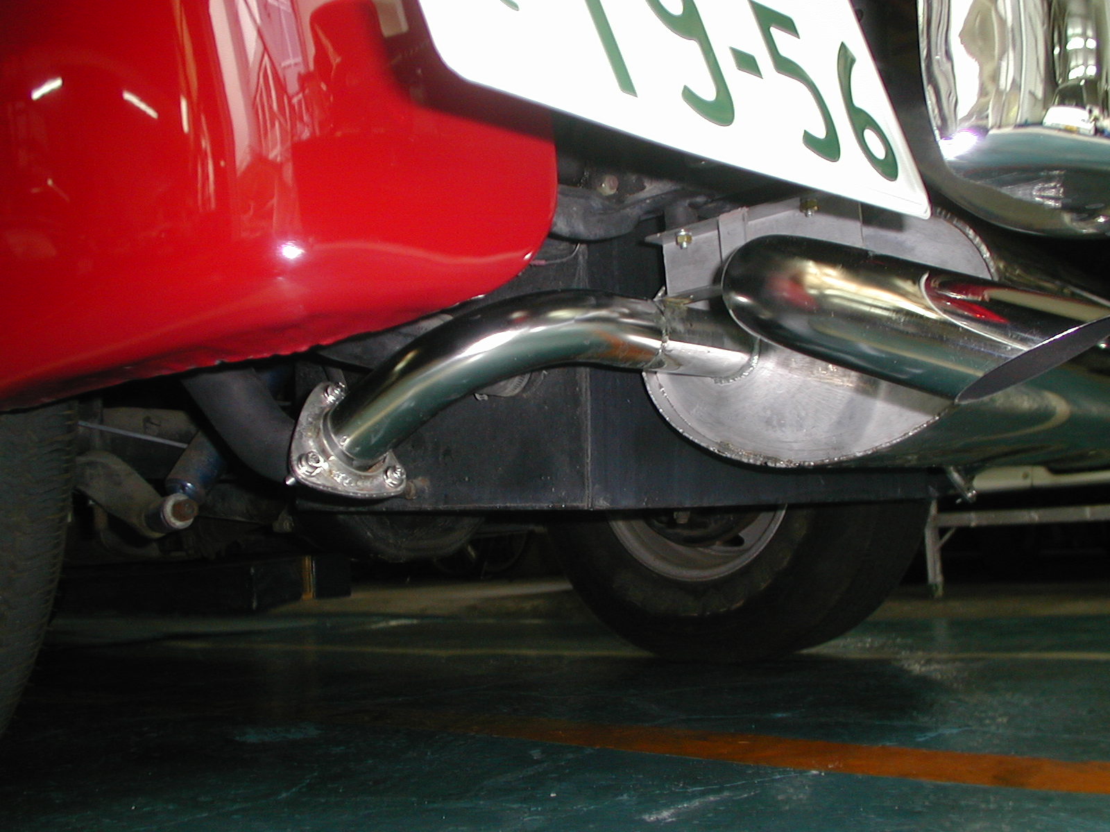 フレームに防振用の耐熱マウントゴムで吊り下げて取付ました。 今後の修理での作業性を考慮して、現車のパイプとの連結はジョイントを製作して取り付けました。